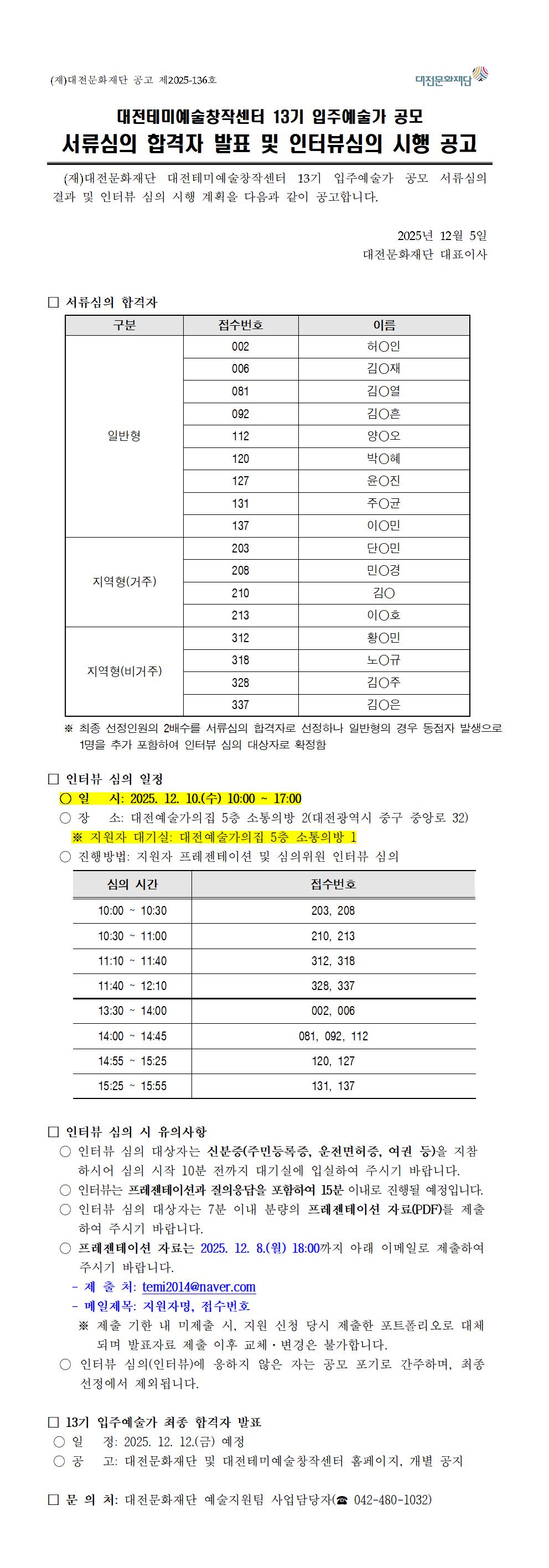 대전테미예술창작센터 13기 입주예술가 공모 서류심의 합격자 발표 및 인터뷰심의 시행 공고