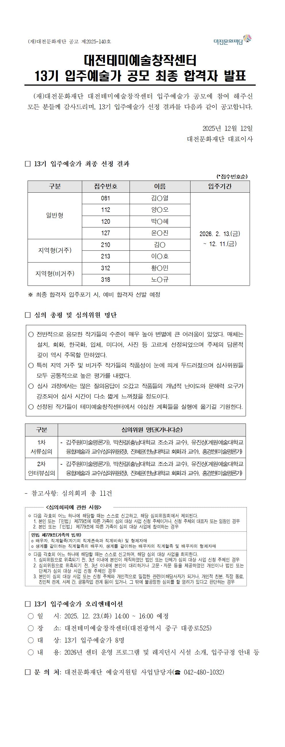 13기 입주예술가 공모 최종 합격자 발표 공고문001.jpg(326 Kb)
