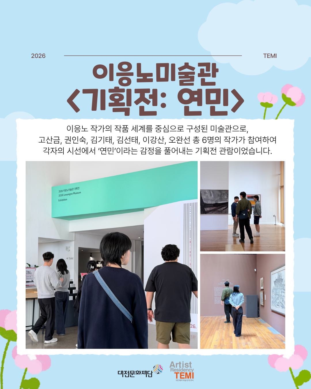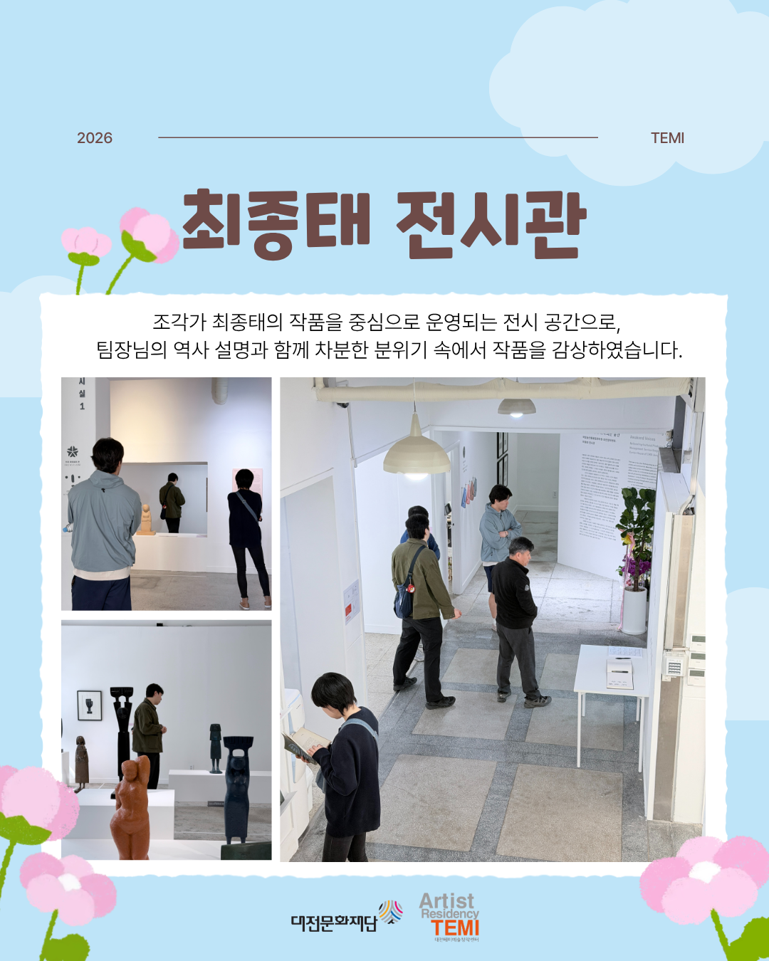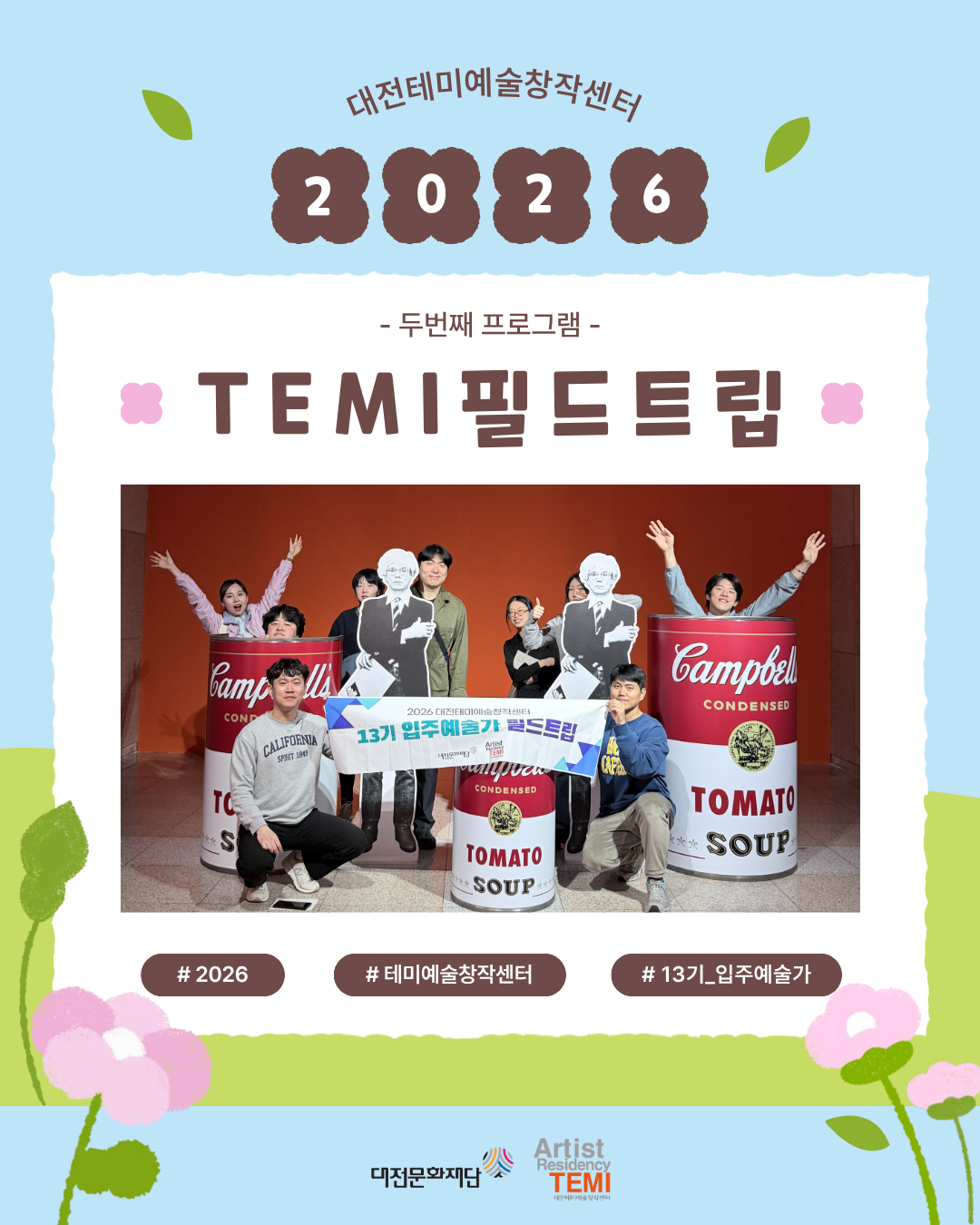 2026년 대전테미옝술창작센터 TEMI 필드트립4월 15일, 13기 입주예술가들가 함께 필드트립을 다녀왔습니다!최종태 전시관, 헤레디움, 대전시립미술관, 이응노 미술관을 방문하여팀장님의 역사 설명도 듣고 다양한 예술품을 접하며 창작 아이디어를 확장시킨 뜻깊은 시간이었습니다 :)5월에 진행될 오픈스튜디오 진행도 기대해주세요