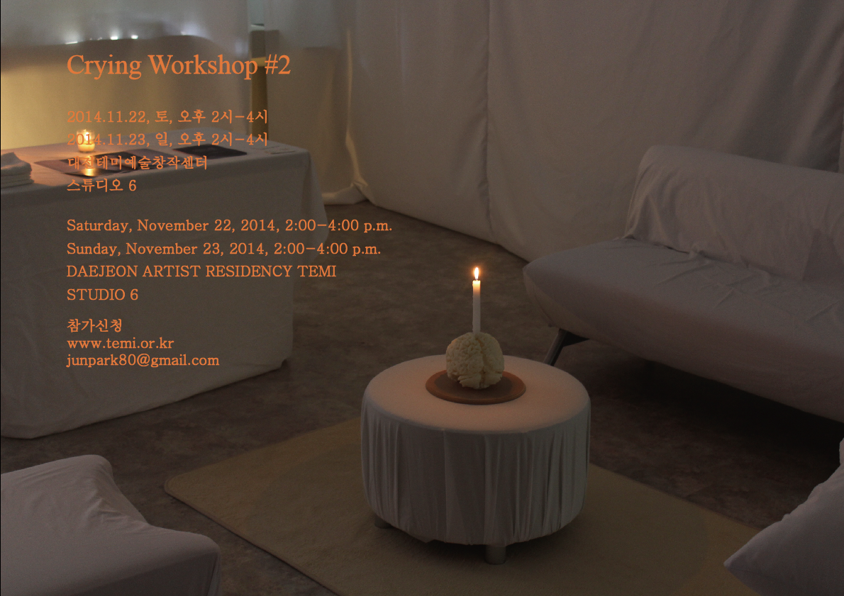 본 워크숍은 '슬픔' 에 관해 이야기하고자 한다. 슬픔은 인간이 느끼는 가장 원초적인 감성이다. 우리 모두는 태어나는 순간, 울음을 먼저 배운다. 작가는 1년 여 간 거주한 스튜디오의 벽면을 비롯한 모든 사물을 하얀색 천으로 감싼다. 중앙에 위치한 테이블 위에는 작가의 뇌를 본따 만든 조형물이 올려져있다. 참여자가 뇌 조형물에 얹어있는 양초에 불을 붙이며 워크숍은 시작된다. 초가 타 들어가는 동안, 작가와 참여자는 대화를 나누며 교감한다. 슬픔을 가지고 있으며, 이를 느끼는 사람은 누구나 워크숍에 참여할 수 있다. 참여자는 마음 속의 슬픔과 고민거리를 안고 있는 상태로, 작가는 이런 마음 속 이야기를 들어줄 준비가 되어있다. 작가 또한 여과없이 자신의 고민과 슬픔을 참여자에게 털어논다. 작가는 최대한 참여자의 감정 상태를 배려하고, 모든 이야기는 비공개로 이루어진다. 타인과의 '대화'와 '울음'을 통해 누군가에게 자신의 마음을 털어놓는 치유의 목적으로써 워크숍은 이루어진다.
