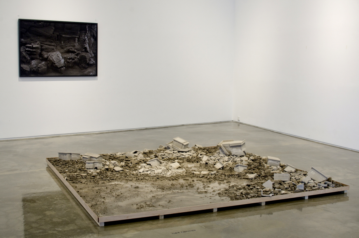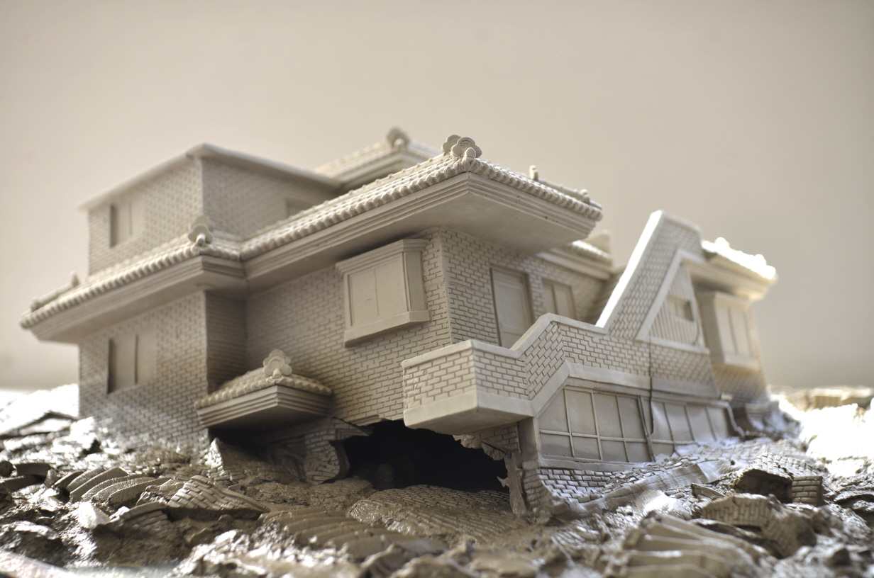 KIM Juree (1980~) ponders on modern life focused on materials using the mediums of ‘earth’ and ‘water,’ which are two of the most basic materials that signify the beginning of life and formation of things. Water being poured on a house built in a perfect shape with earth plays the dual role of destruction and revivification, which in turn finishes the process of annihilation. Earth and water are two different forms of matter when they are separated, but when they come in contact with each other, they become one by disintegrating and completing self-denial. By speeding up time and showing the process of the destruction of the house, the artist tells a story about the circumstances of the present age and the frailty of materials.Houses presented in the housing series of Hwigyeong are those mass-produced in the 1970s and 1980s. The artist delivers the story of these houses that still play their role as old-style housing in various parts of the city, although they are gradually declining in number and will eventually vanish from sight.In Landscape-scene, fragments and remnants of a city in ruins have been turned into earth and are being eroded by water being poured on them. The processes of building architecture — the product of the time in which the contemporary spirit, culture, materials and circumstances are mingled — with earth and dissolving it with water represent the natural algorithm of creation and destruction, and are founded in the interest in life and contemplation on a self-reflective existence.