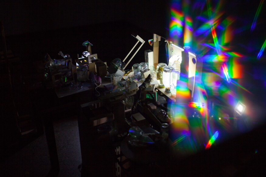The World of Things Lost and Rainbow Trap are parts of the ongoing project Voyage to the Lost Futures , which examines the things that get otherized in the process of observation and collection of ecological environment. Collected items that look worthless, such as parts fallen from creatures with the passage of time and things that no longer work, are illuminated using a device that generates a materialistic imagination. This experiment is carried out through video and installation works that reveal things that have been neglected and expand narrow areas.